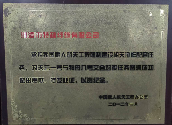 2011年9月29日,“神猴電纜”助力“天宮一號(hào)”,用長(zhǎng)征二號(hào)F火箭將“天宮一號(hào)”目標(biāo)器發(fā)射升空,同年,受到了中國(guó)載人航天工程辦公室的表彰